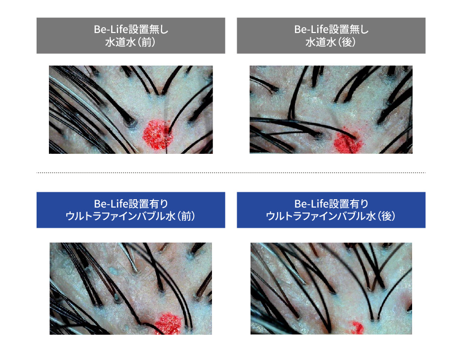 | 試験方法 | 頭皮にウルトラファインバブル水と水道水をシャワーで1分間洗浄し汚れ落ちを比較検証した。 1分間洗浄:30秒間洗髪ブラシで洗浄+30秒は手で洗浄 (シャワーヘッドは、頭皮から約10cm離し洗浄) SANEI(サンエイ株式会社) 型式 PS39-80X-W |