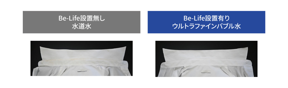 | 試験方法 | 10か月同条件で着用後、ウルトラファインバブル水と水道水で洗濯を繰り返した場合、衣類に対する汚れ落ちを比較検証した。 |