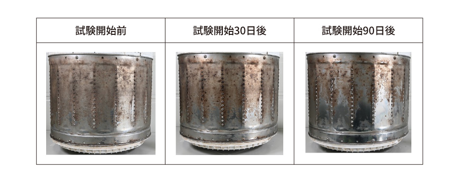 | 試験方法 | 1日1回洗濯し、洗濯開始から30日後、60日後、90日後の洗濯槽の洗浄作用を比較検証した。 |
