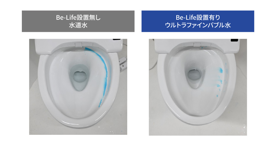| 試験内容 | トイレの便器内に疑似汚れ(食用色素青+水アメ)を塗布しウルトラファインバブル水と水道水それぞれで流水後の汚れ残りを比較検証した。 |