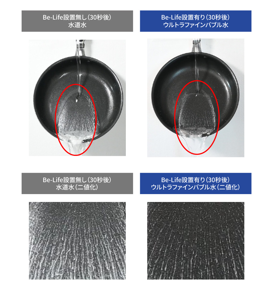 | 試験方法 | プライパンに疑似汚れ(サラダ油+食用色素白)を塗布し、ウルトラファインバブル水と水道水を通水し、残存している汚れを比較検証をした。 |