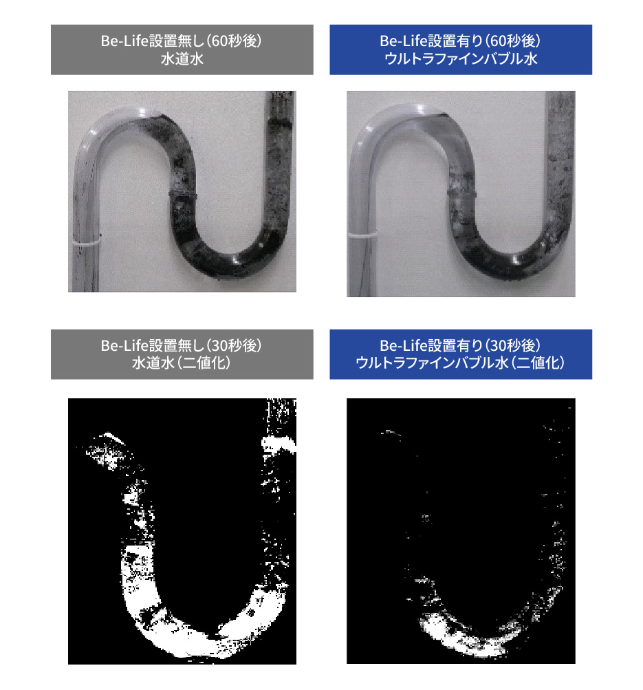| 試験方法 | アクリル透明排水管(疑似配管)に疑似汚れ(黒色トナー)を溜めウルトラファインバブル水と水道水を通水し、疑似配管に付着している汚れを比較検証した。 |