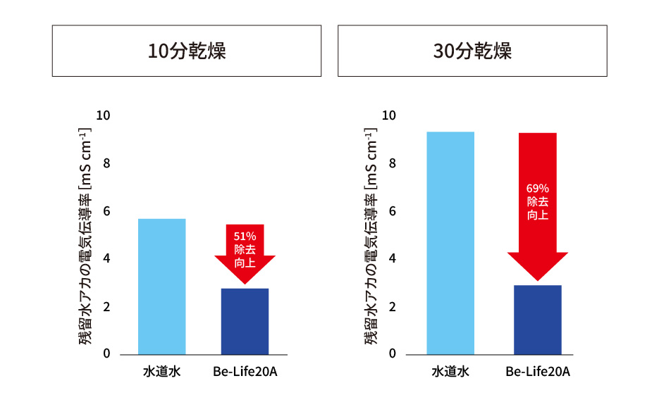 | 試験条件 | 対象商品:Be-Life20A 試験水:水道水 水温: 14℃ 湿度:70% 気温:13% 洗浄水圧:2.0MPa 流量:17ℓ/min 人口水垢:塩化カリウム水溶液 測定機械:表面塩分計SSM-21P 配管の長さ:約15mの条件 |