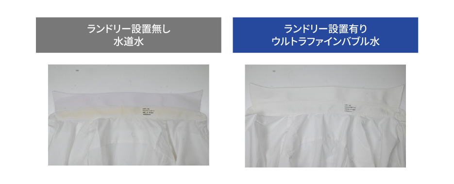 | 試験方法 | 同種の洗濯機を用いてYシャツの襟に皮脂の疑似汚れ(四酪酸リボフラビン)を均等に塗布し、ウルトラファインバブル水と水道水を同条件で洗濯した場合の汚れ落ちを比較検証した。 |