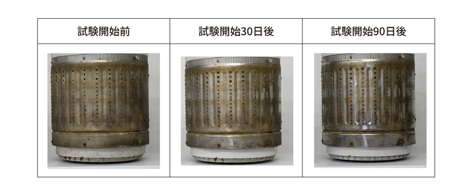 | 試験方法 | 1日1回洗濯し、洗濯開始から30日後、60日後、90日後の洗濯槽の洗浄作用を比較検証した。 |